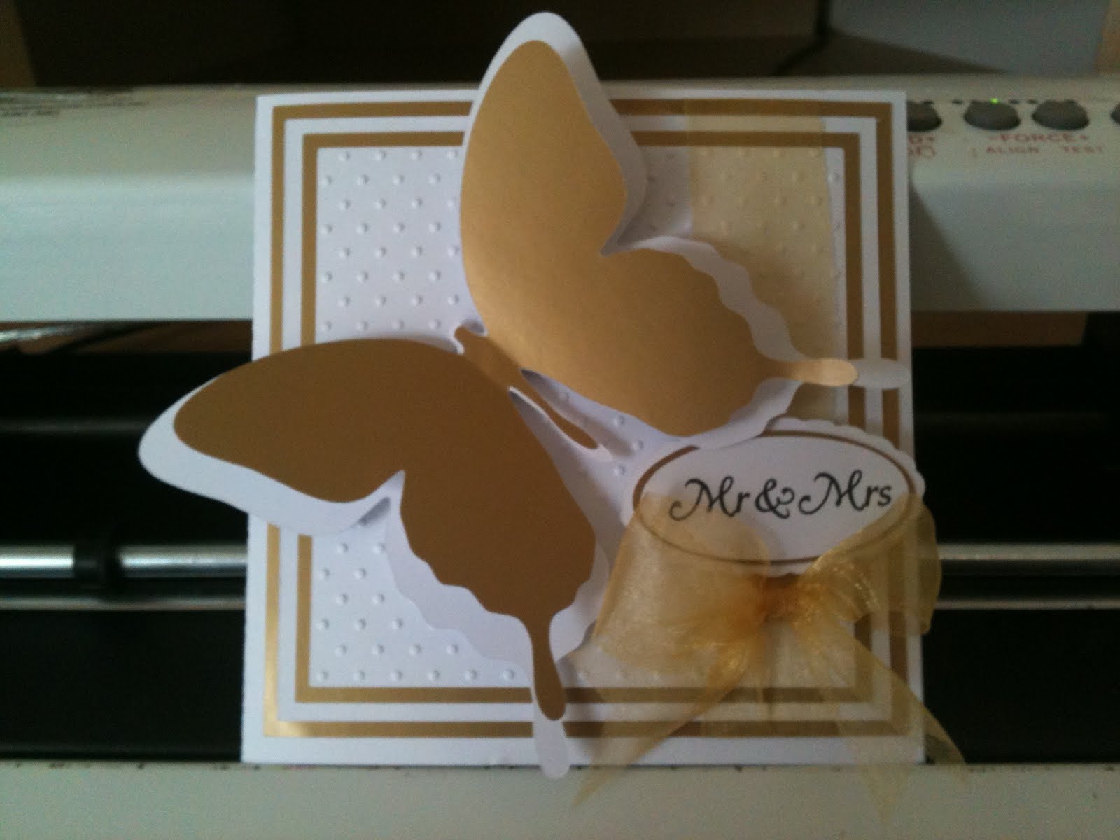 Here's the card I made for my dad's wedding next weekend. The colour scheme is gold and his wife to be loves butterflies.Everything here was cut out on Gazza, including the printed and cut Mr & Mrs label. I used a cuttlebug swiss dots embossing folder as well.